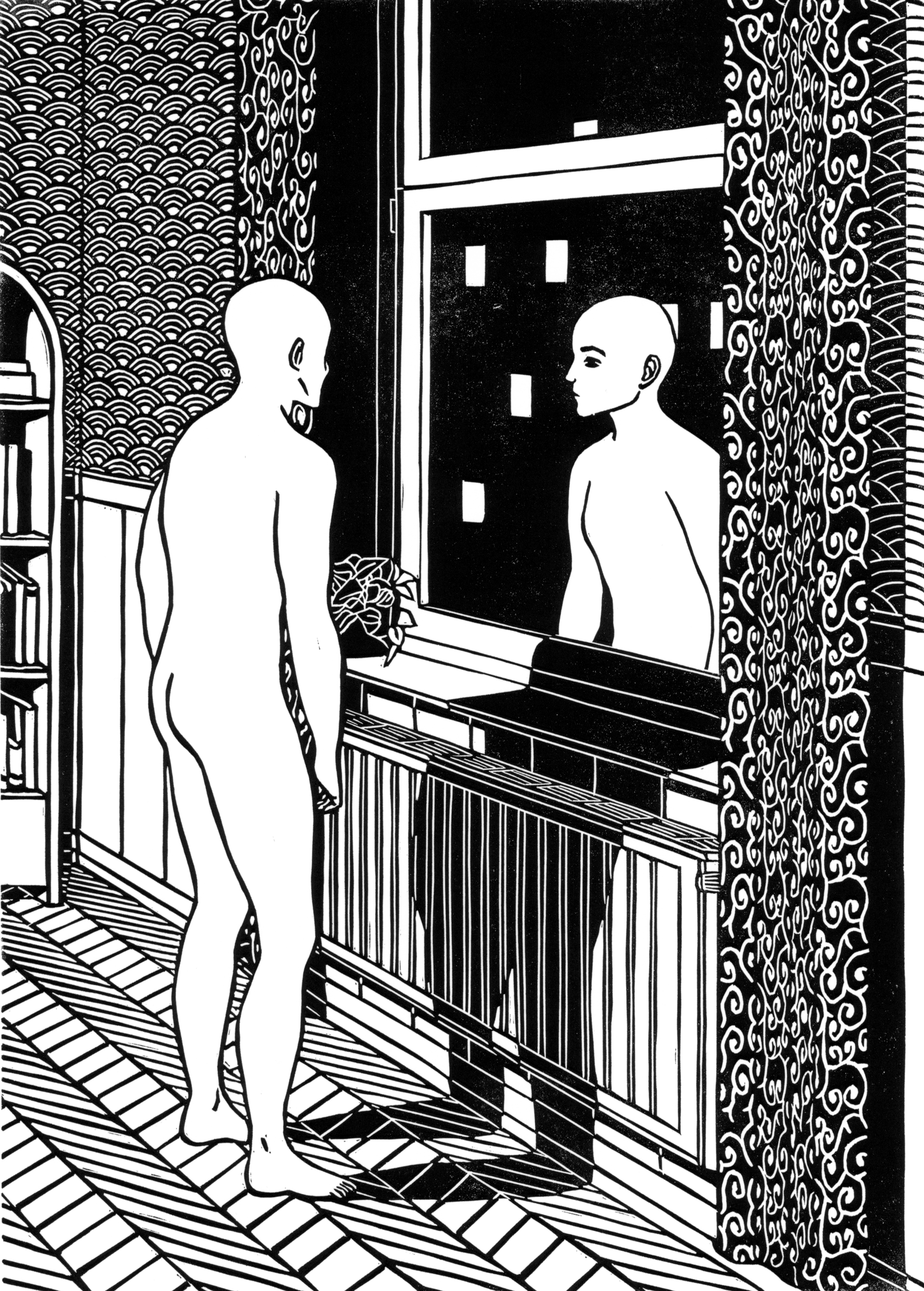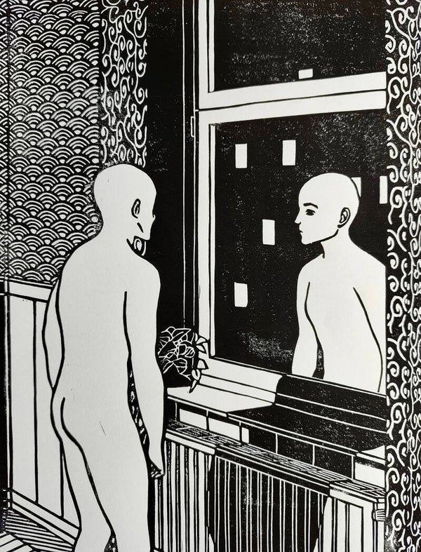 Materials: black aqua linoprint ink, 120 g/m² off-white paper