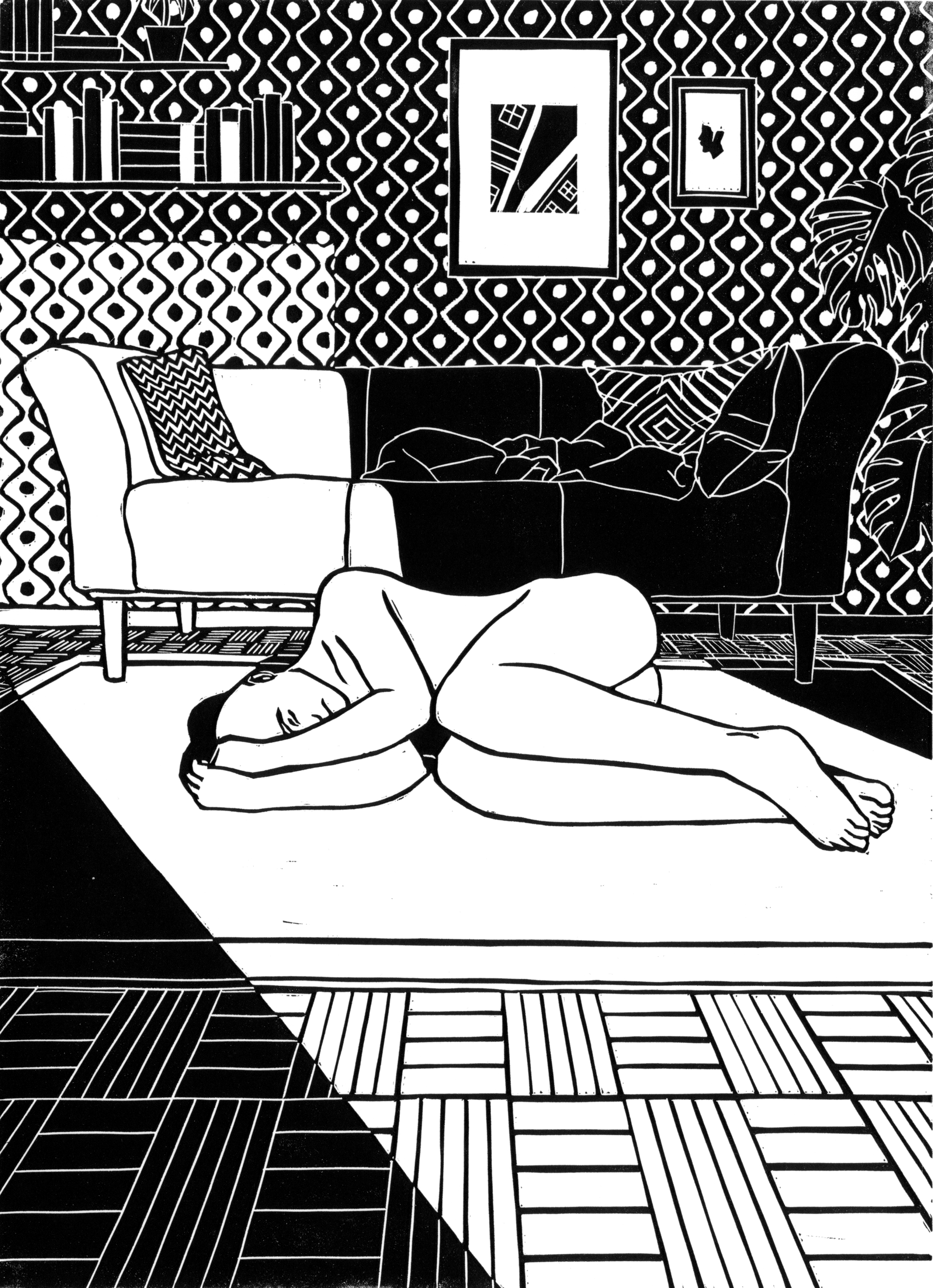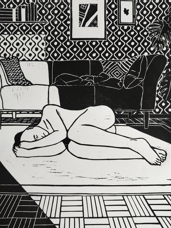 Materials: black aqua linoprint ink, 120 g/m² off-white paper